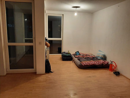 És itt van két kép, amin látszik némi változás. Az egyik első este, felfújható matraccal, a másik néhány héttel később, miután összeraktam az ágyat.
